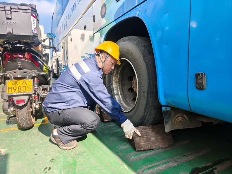 春运期间,进出岛的车流量大幅增加。作为水手长,刘昱一个班次要指挥近300辆车停靠,弯腰搬取三角木400余次,在钢铁甲板上行走超过25000步。“车辆停放必须安全有序,既要稳,也要快。”他说。
